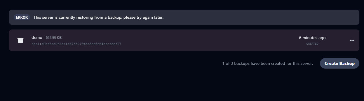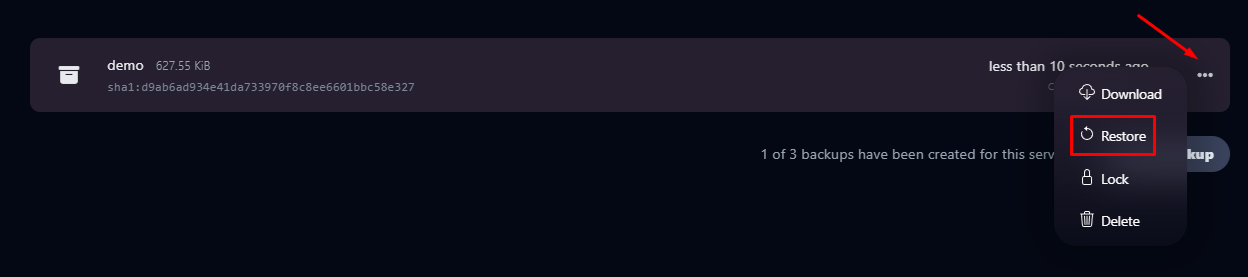 Để tiến hành restore backup ta quay lại tab Backups và chọn vào file backup cần restore