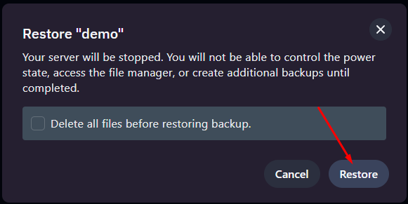 Tích vào Delete all files before restoring backup nếu muốn xóa hết các file rồi mới restore (chỉ áp dụng nếu file backup ở mục một không loại trừ bất kỳ file/thư mục nào)