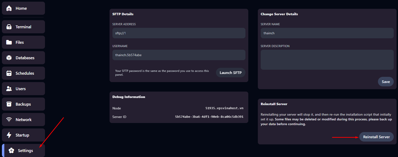 Quay lại Panel và nhập các thông số cần thiết ở tab Startup, sau đó nhấn Reinstall Server ở phần Settings, đợi cho quá trình cài đặt hoàn tất rồi khởi động server