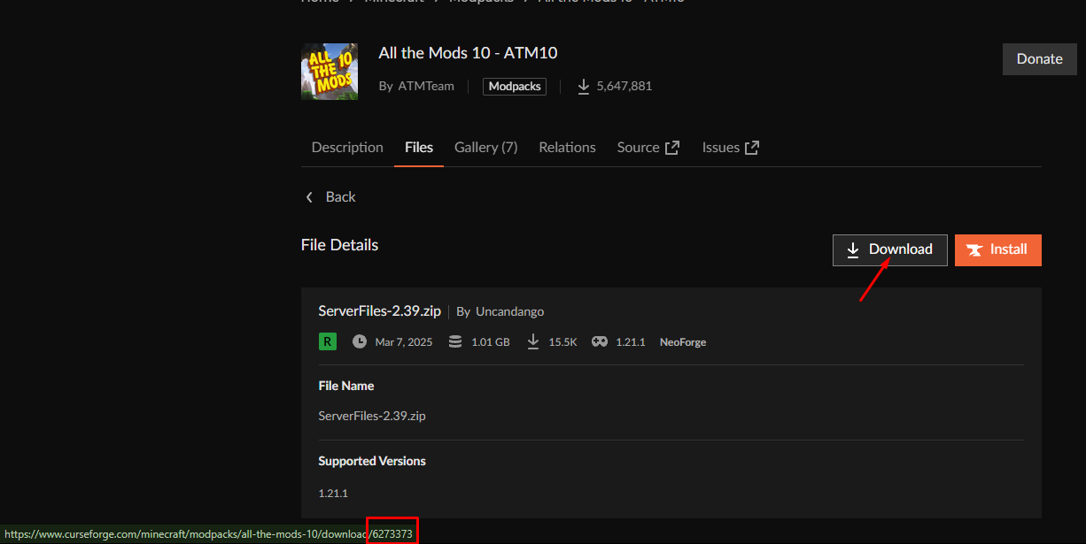 Mặc định sẽ tải phiên bản mới nhất của modpack, nếu cần chỉ định phiên bản thì ta sẽ điền thông số của phiên bản vào Modpack File ID