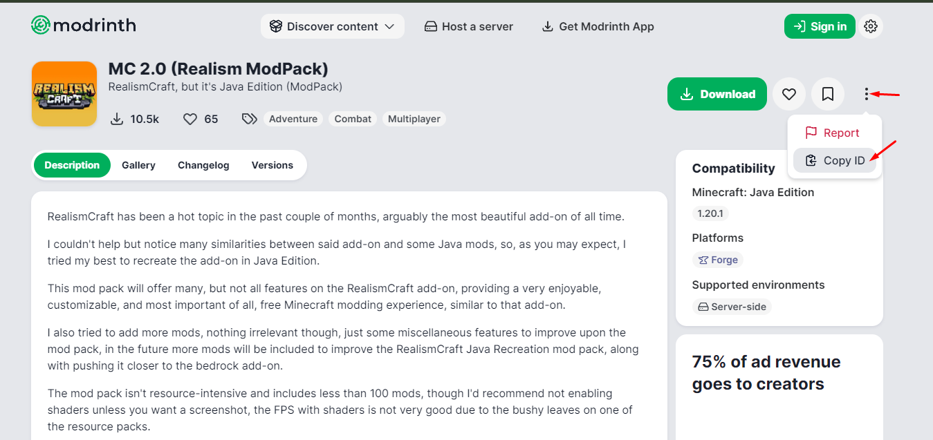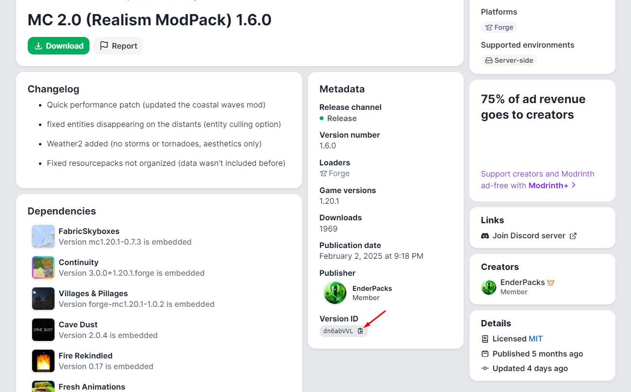 Ta để ý 2 thông số là Modpack Project ID và Modpack Version ID, 2 thông số này đều được lấy từ modpack trên Modrinth