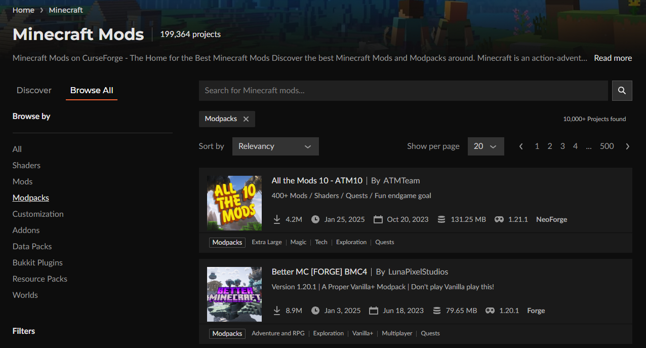 Tương tự với mục 1. , sau khi liên hệ kỹ thuật viên nhằm chuyển đổi server qua kênh email hoặc livechat (CurseForge), ta truy cập phần modpack của CurseForge và tìm kiếm modpack cần cài đặt.