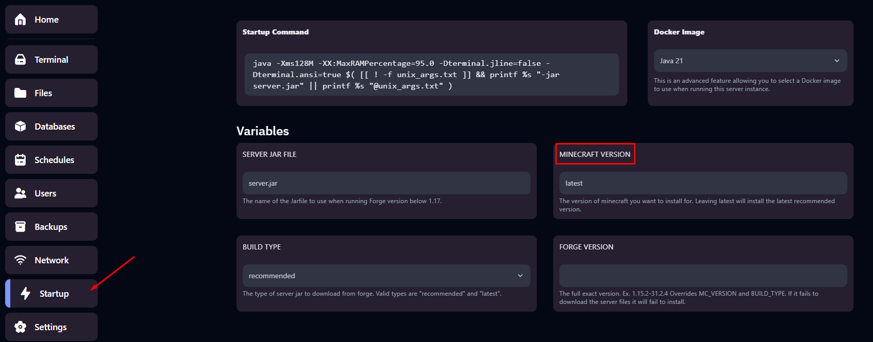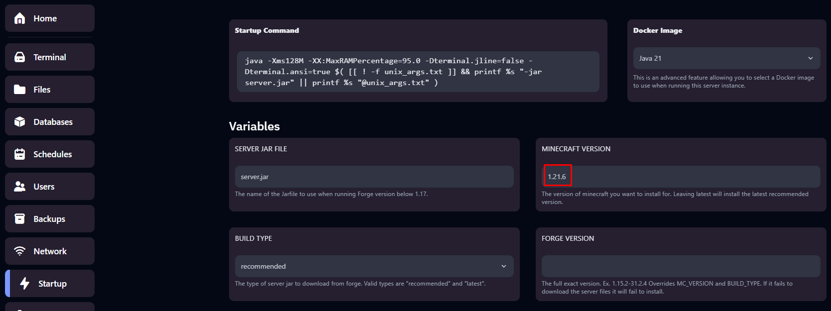 Ví dụ ta cần cài đặt Forge cho phiên bản Minecraft 1.21.6 thì ta cần điền 1.21.6 vào thông số MINECRAFT VERSION: