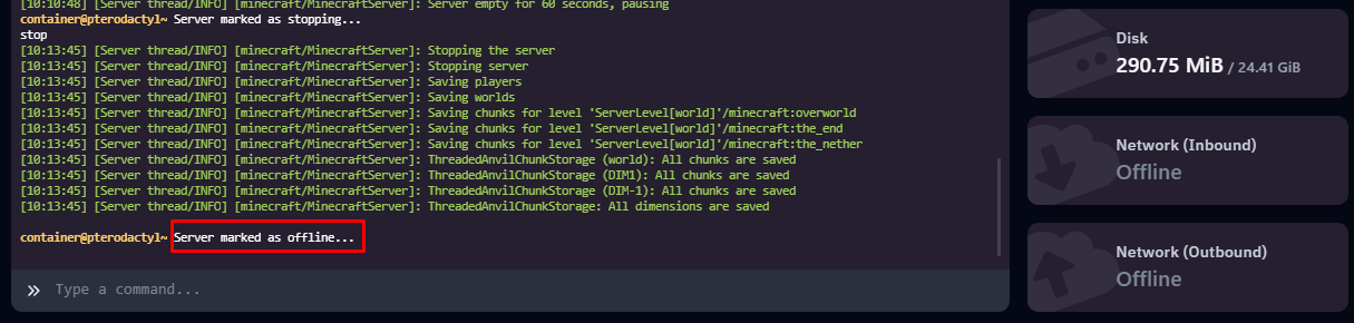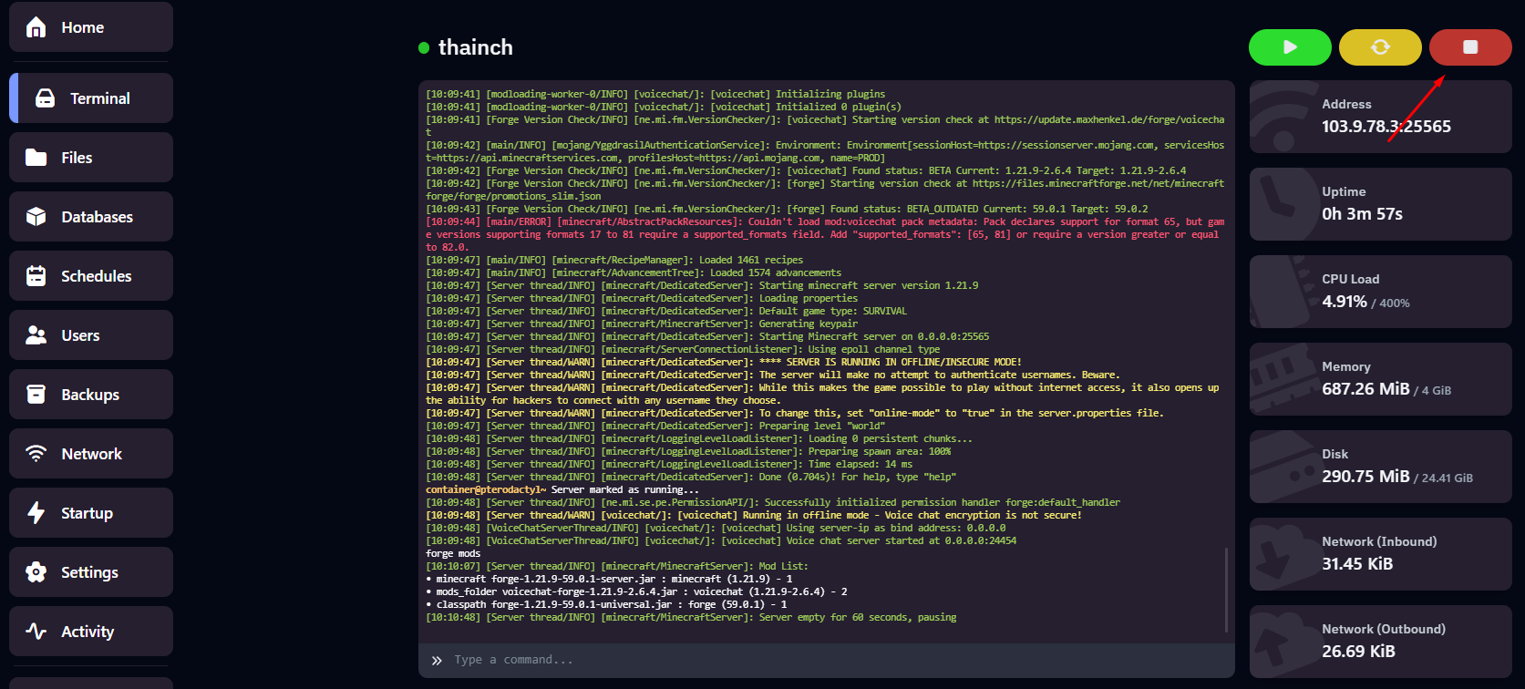 Ta truy cập panel và chọn Stop để tắt server